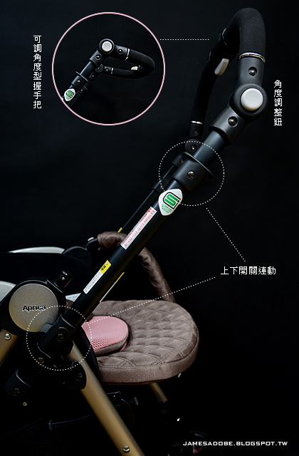 在車體結構的中心支點鑲上大大的品牌識別,一旁白色按鈕是『開放型安全扶手』的開關,為求安全起見,廠商故意設計的有點卡,避免嬰幼兒去誤觸按壓導致扶手脫落,說明書上還特定提醒:這開關千萬別上潤滑油喔!