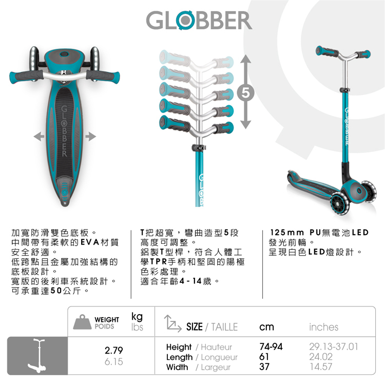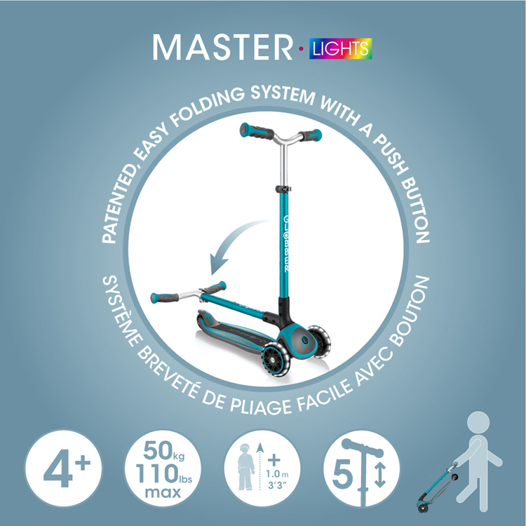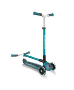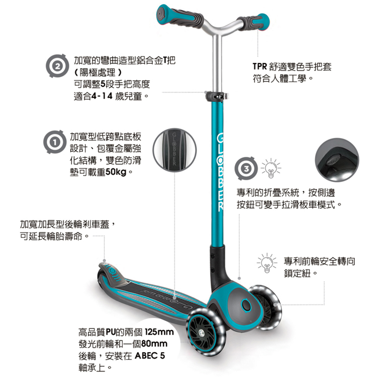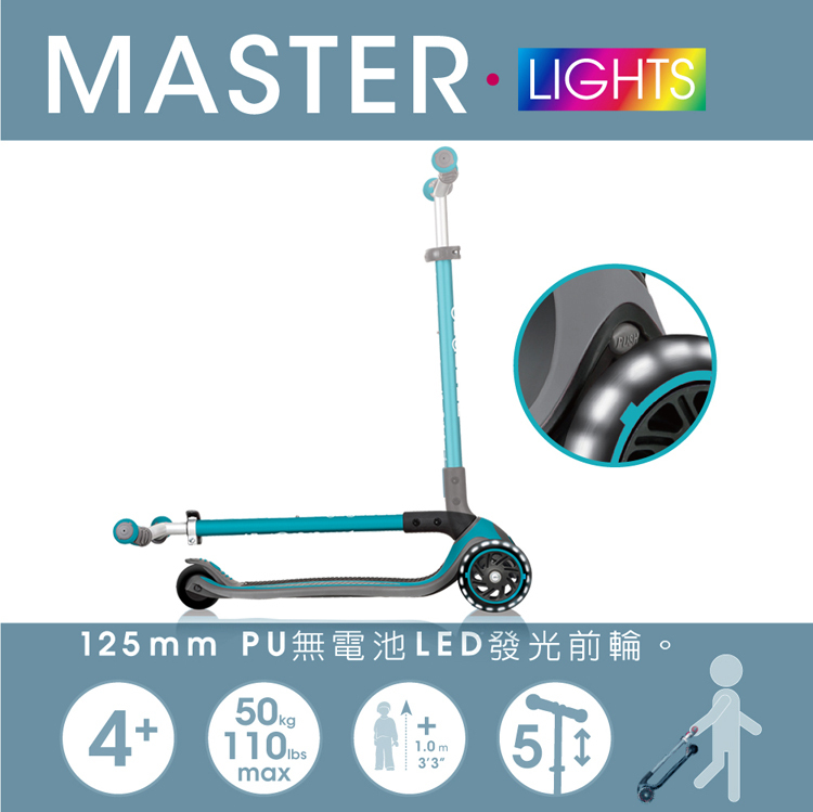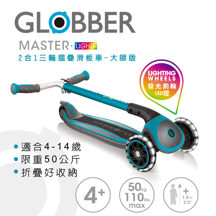 GLOBBER 2合1三輪折疊滑板車大師版(酷炫白光發光輪)-藍綠色