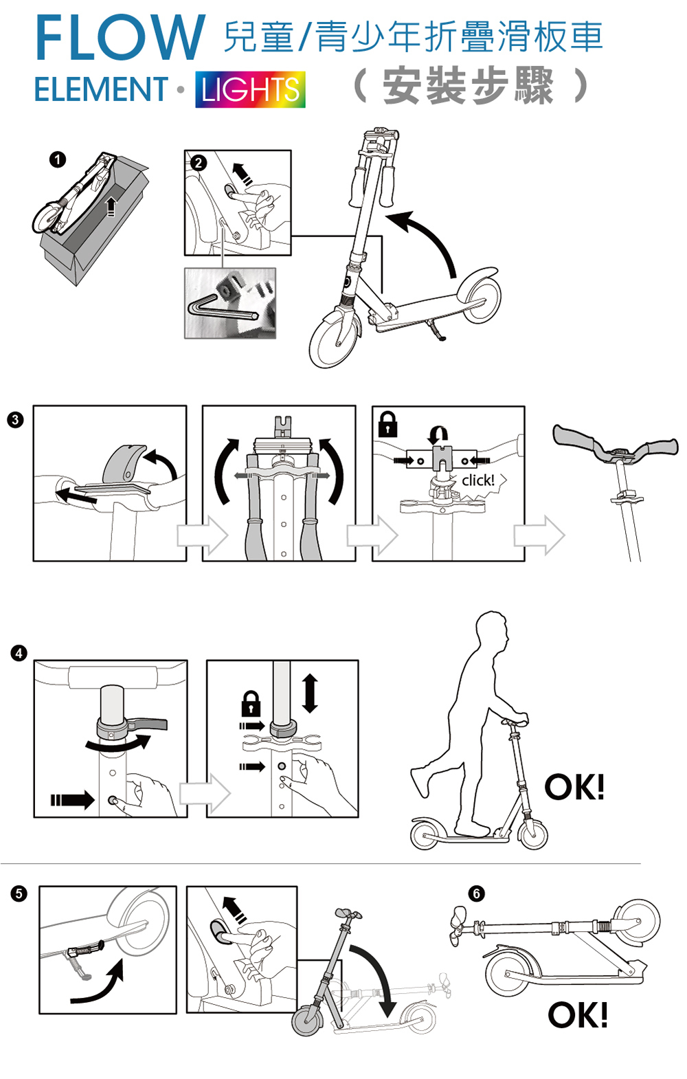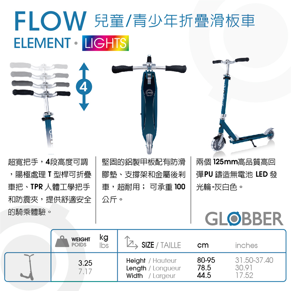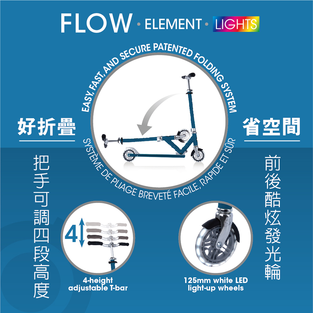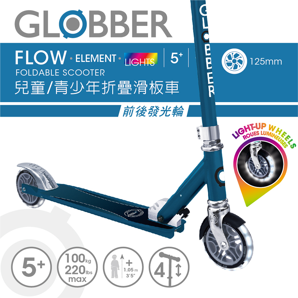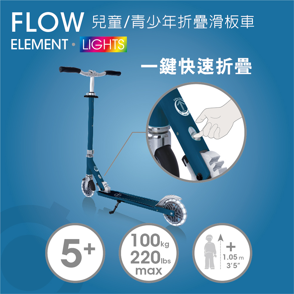 GLOBBER FLOW ELEMENT LIGHTS 兒童/青少年折疊滑板車(酷炫白光發光前後輪)-復古藍